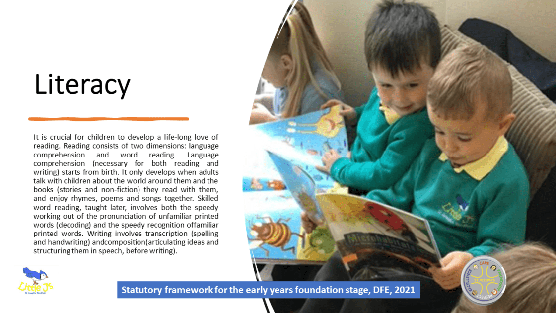 Here at St. Joseph’s, we provide a language rich environment that ensures children are exposed to a wide range of both spoken and written vocabulary. Children are supported to use ambitious vocabulary and understand this through discussion with teachers as part of communication and language development.
